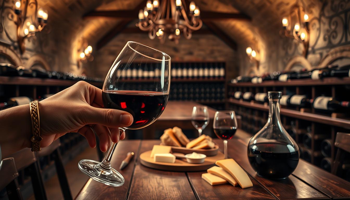 A sophisticated gentleman in a tailored suit carefully decants a rich, ruby-red Bordeaux wine into a delicate crystal decanter. The room is bathed in warm, golden light, casting a soft glow on the scene. The wine's bouquet fills the air, hinting at its depth and complexity. The gentleman's movements are graceful and deliberate, as he elevates the ritual of wine tasting. In the background, a sturdy oak wine rack and a collection of fine glassware suggest an appreciation for the art of oenology. This image captures the essence of the refined and thoughtful experience of properly enjoying a well-aged red wine.