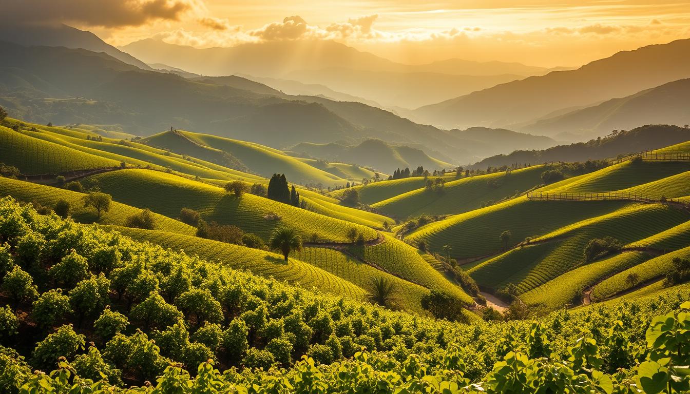 A lush, rolling landscape of verdant vineyards nestled in the Serra Gaúcha mountains of southern Brazil. In the foreground, rows of grapevines stretch out in geometric patterns, their leaves glistening under the warm, golden sunlight. In the middle ground, stone-walled terraces cascade down the gentle slopes, dotted with quaint, red-roofed buildings. The background is dominated by the majestic, blue-hued peaks of the Serra Gaúcha, their rugged slopes rising up to meet the azure sky. A serene, picturesque scene that captures the essence of Brazil's premier wine-producing region.