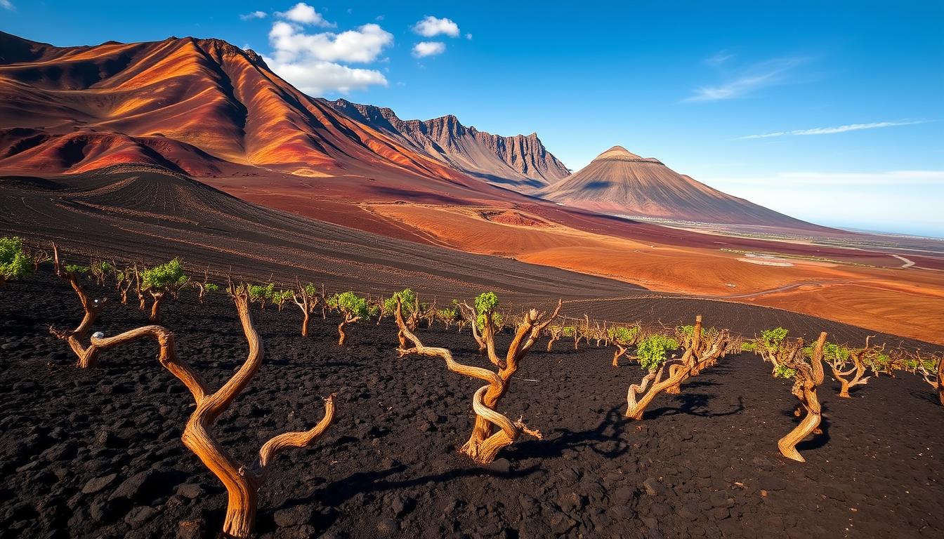 Der Vulkan Timanfaya formte 1730-36 durch seinen Ausbruch die heutige Lavaschicht aus Lapilli, die zum Paradies für Weinbau wurde. Die Pflanzen wachsen oft wurzelecht im Alberello-System, geschützt vor Schädlingen durch die isolierte Lage.