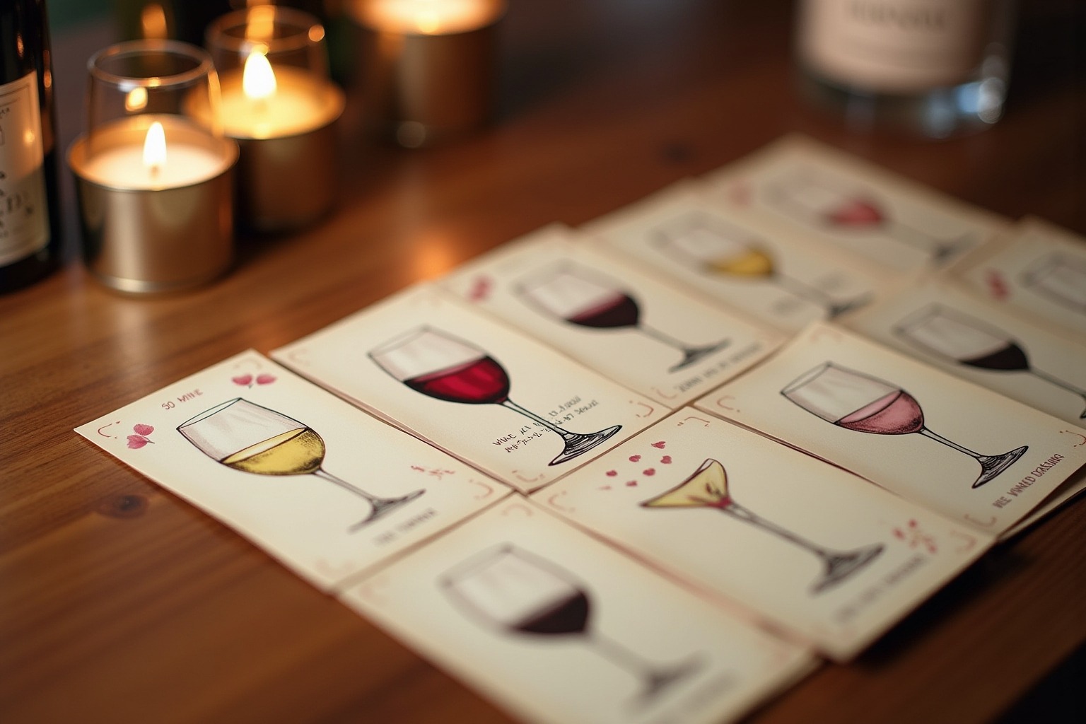 Das Angebot an Wein-Tasting-Spiele-Karten ist vielfältig und deckt unterschiedliche Spielkonzepte ab. Klassische Verkostungskarten enthalten Anleitungen zur systematischen Weinprobe mit Fokus auf Farbe, Aroma und Geschmack. Weinquiz-Karten testen das Weinwissen der Teilnehmer mit Fragen zu Rebsorten, Anbaugebieten und Herstellungsmethoden. Für Einsteiger gibt es didaktische Sets, die Grundbegriffe der Önologie erklären. Besonders beliebt sind Blindverkostungs-Karten, bei denen die Spieler Weine ohne Kenntnis der Etiketten erraten müssen. Daneben existieren thematische Karten zu bestimmten Weinregionen wie Bordeaux oder Toskana sowie Kartenspiele, die Weinverkostung mit Gesellschaftsspielelementen wie «Wahrheit oder Pflicht» kombinieren. Manche Sets fokussieren sich ausschließlich auf bestimmte Weinsorten wie Rotwein oder Schaumwein.