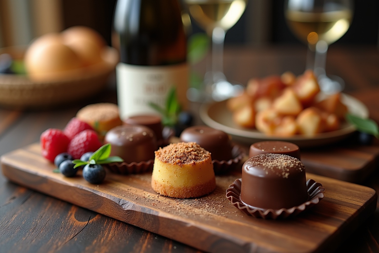 Bei gefüllten Konfektstücken oder aromatisierten Schokoladenspezialitäten steht die Füllung bzw. das Aroma im Zentrum der Weinauswahl. Für Pralinés mit Nussfüllungen eignen sich oxidativ ausgebaute Weine wie Sherry oder Madeira. Bei Fruchtfüllungen harmonieren gleichartige Fruchtnoten im Wein – etwa Himbeer-Trüffel mit einem Spätburgunder, der Himbeernoten aufweist. Für Karamell- oder Kaffeefüllungen bieten sich Süßweine mit entsprechenden Röstnoten an. Orangenschokolade ergänzt sich wunderbar mit Orange-Muscat. Schokoladen mit Gewürzen wie Zimt oder Kardamom finden im Gewürztraminer einen ebenbürtigen Partner. Bei der Verkostung sollte man stets vom leichteren zum kräftigeren Geschmackserlebnis voranschreiten und zwischen den Proben Wasser trinken, um den Gaumen zu neutralisieren.